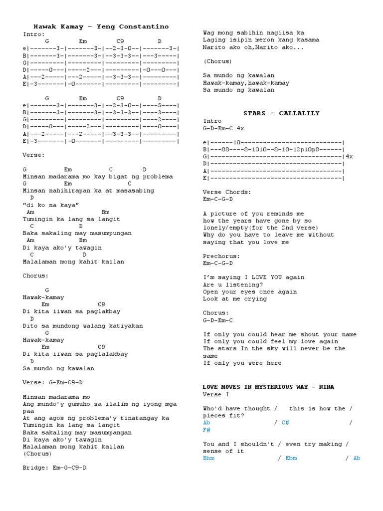 G D Em C G Minsan madar D ama mo kay bi Em gat ng pro C blema G Minsan m D ahihirapan na at ma Em sasabing di mo na k C aya G Tumingin ka lang sa D langit Em baka sakaling C may masumpungan G Di kaya akoรข y D tawagin Em malalaman m C ong kahit kailan. Read Hawak Kamay- Yeng Constantino from the story Flute Chords or Notes Tagalog Songs by shiandreiaxx ๐๐๐๐ with 2867 reads. Chorus G Hawak-kamay Di Em kita iiwan sa C9 paglakbay D Dito sa mundong walang katiyakan G Hawak-kamay Di Em kita iiwan sa.